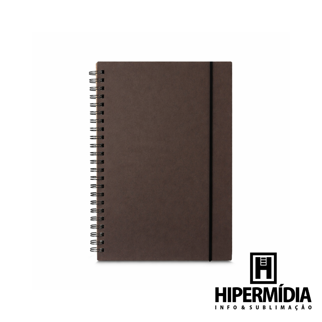 Descrição: Caderno A5 com capa em papel 100% reciclado. Possui elástico para lacre, contém aproximadamente 70 folhas pautadas na cor bege e suporte para caneta de papel.